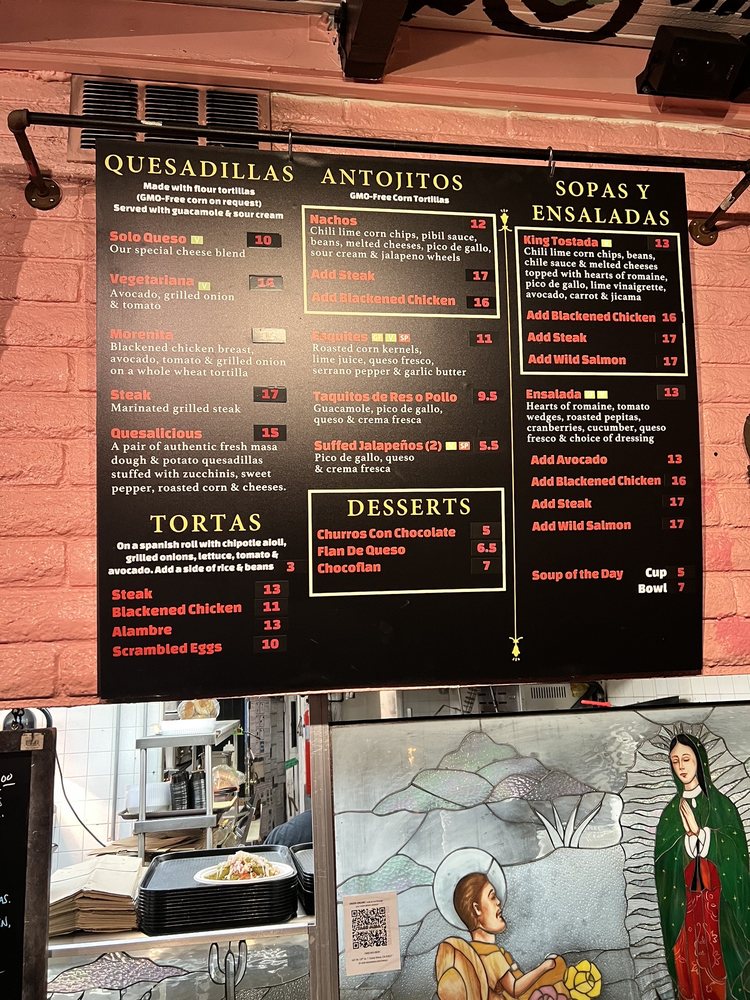 On a flour tortilla (gmo-free corn upon request) with lobster sauteed with spinach, diced zucchini & roasted fresh corn. Topped with a roasted poblano cream sauce & avocado.