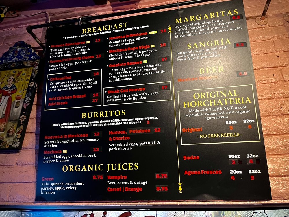 Served with rice & beans. three egg omelette, calabacitas, spinach, roasted corn & cheese. topped with caldillo & tomatillo sauce, sour cream & avocado. choice of tortillas.